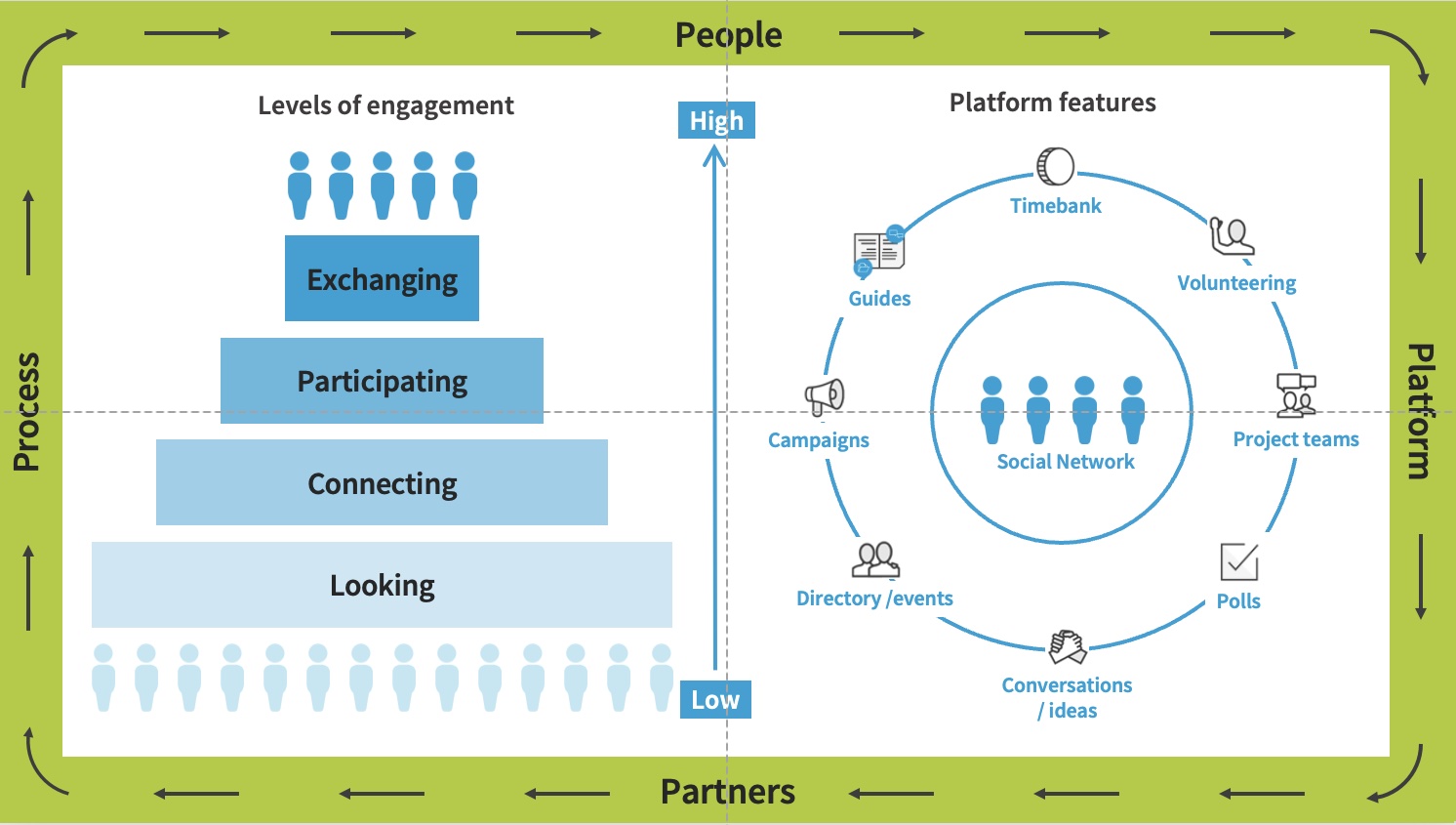 The diagram below illustrates how members typically engage on our platforms. Most members are browsing and looking for information (e.g. finding support). A smaller percentage are engaged in the sharing and exchanging of skills, time and ideas.